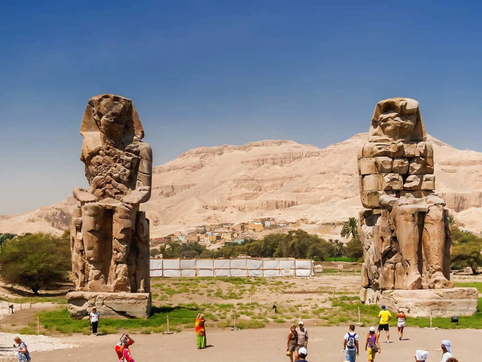 Далее на лодке отправляетесь на другой берег Нила,где посещаете Колоссы Мемнона ,это две огромные статуи высотой 18 метров и весом более 700 тонн каждая. После этого вы посещаете храм Хатшепсут — известный всему миру террасный храм, высеченный в скале,храм состоит из трех открытых террас, поднимающихся по склону скалы. Храм украшен скульптурами, барельефами, рисунками, говорящими о жизни царицы .